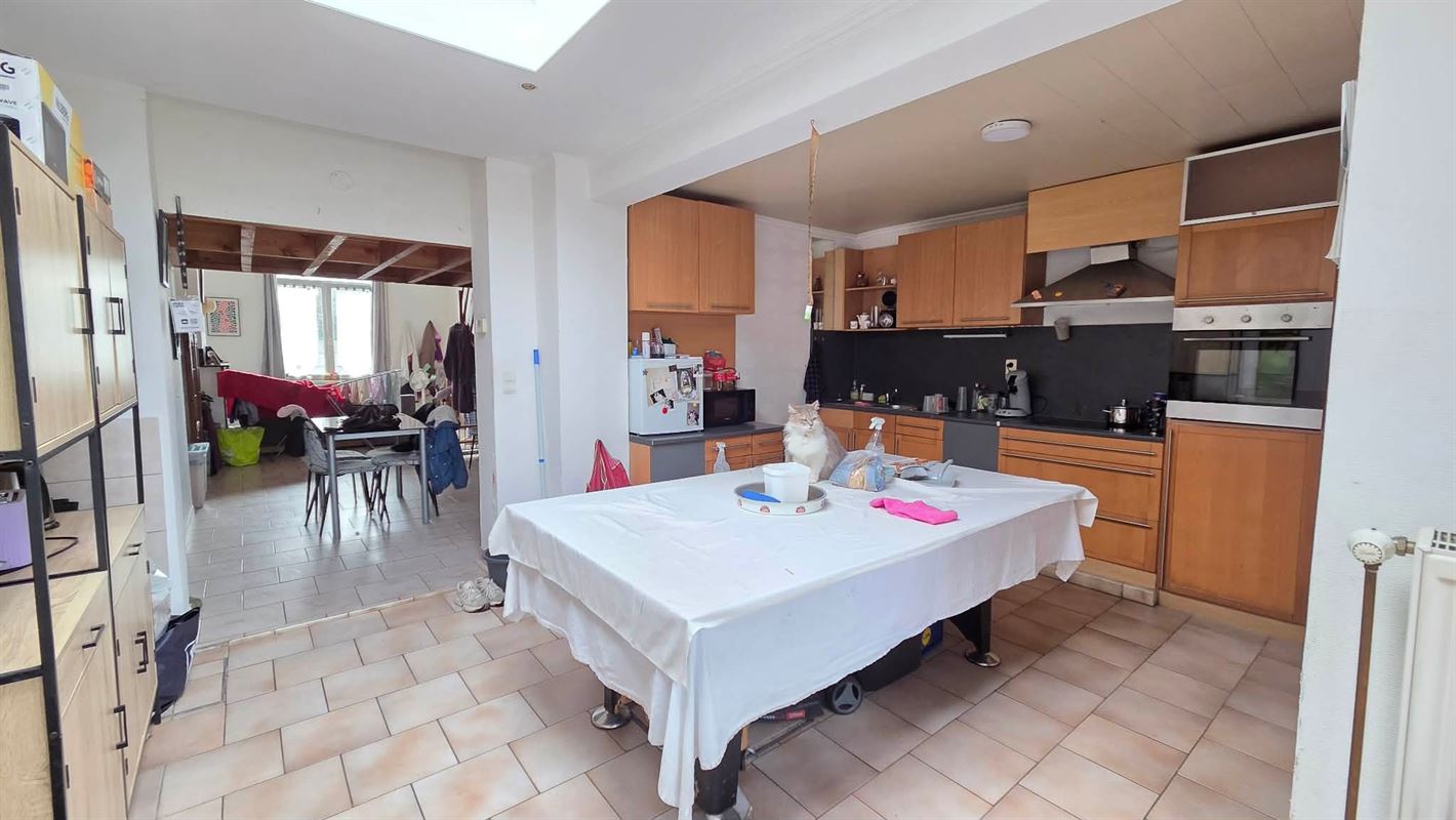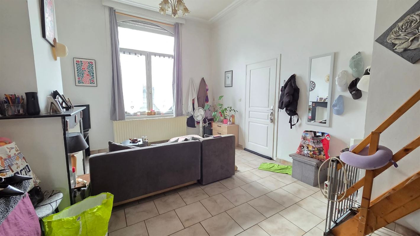 À l'étage, un appartement lumineux de ±63 m² se compose d'un salon/salle à manger, dune cuisine équipée, d'une salle d'eau et de deux chambres, actuellement loué 590 /mois.