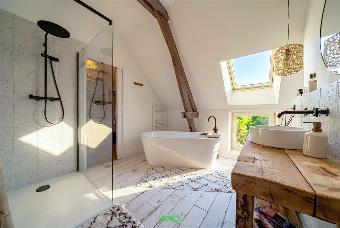 La cuisine récente propose un cadre cosy, idéal pour les amateurs de cuisine. À l'étage, vous trouverez trois belles chambres rénovées avec goût ainsi qu'une salle de bains équipée dune baignoire et dune douche. Un grenier complète le second niveau.