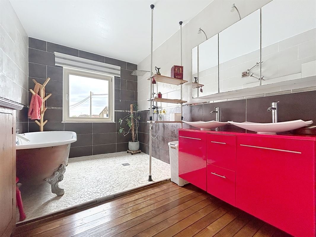 Dès l'entrée, un vaste hall agrémenté d'un escalier en chêne massif donne immédiatement le ton. Le rez-de-chaussée propose une chambre de plain-pied, une spacieuse salle de bain équipée dune douche, dune baignoire et d'un meuble double vasque, ainsi que deux WC séparés.