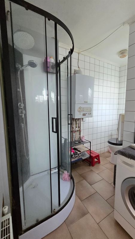 À l'étage, un appartement lumineux de ±63 m² se compose d'un salon/salle à manger, dune cuisine équipée, d'une salle d'eau et de deux chambres, actuellement loué 590 /mois.