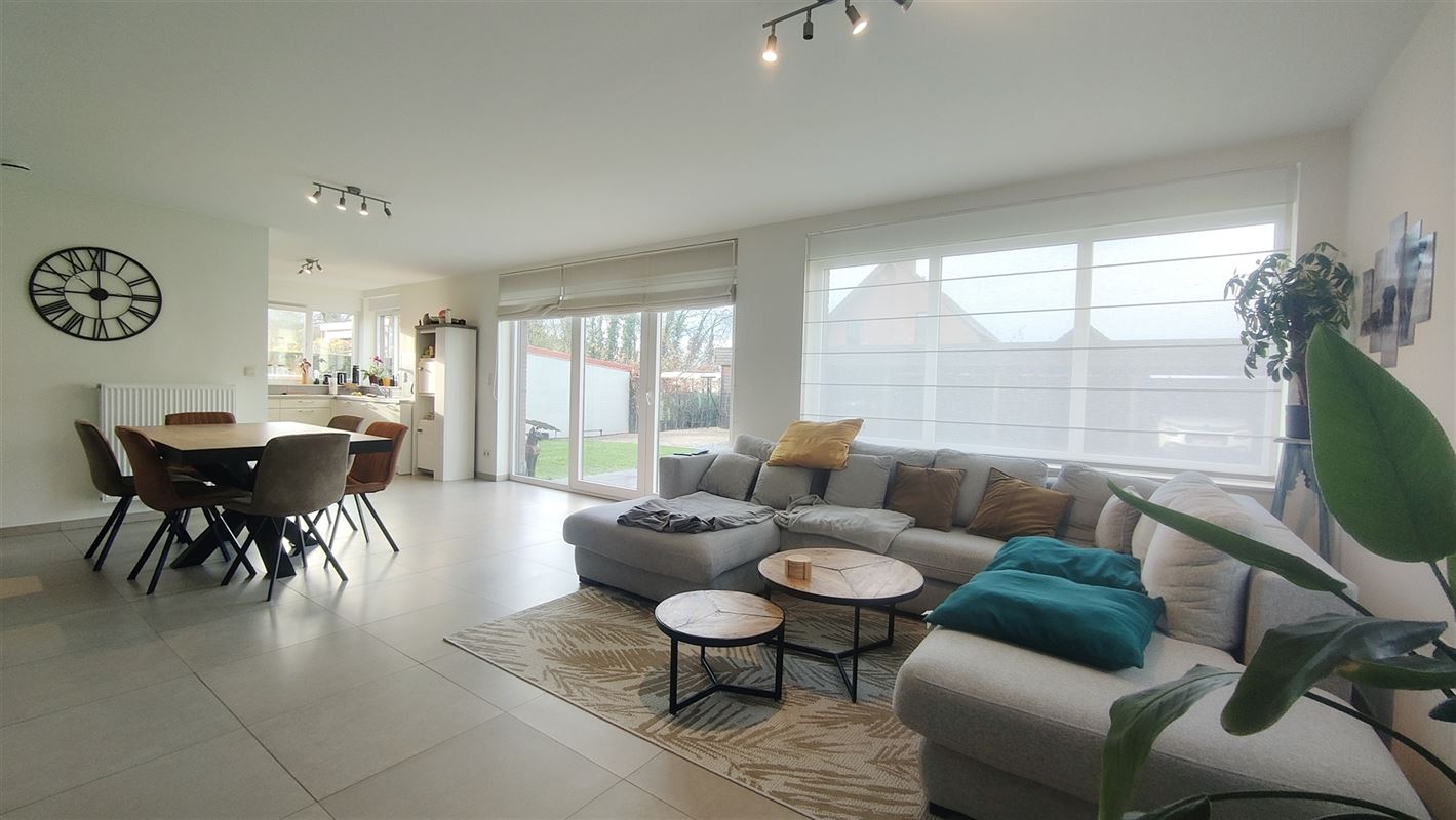 Un hall d'entrée volumineux menant sur un living très lumineux.
