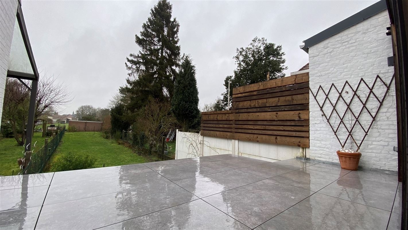 Extérieur : une splendide terrasse vous permettra de profiter des beaux jours. Le jardin de belle taille se trouve en contrebas.