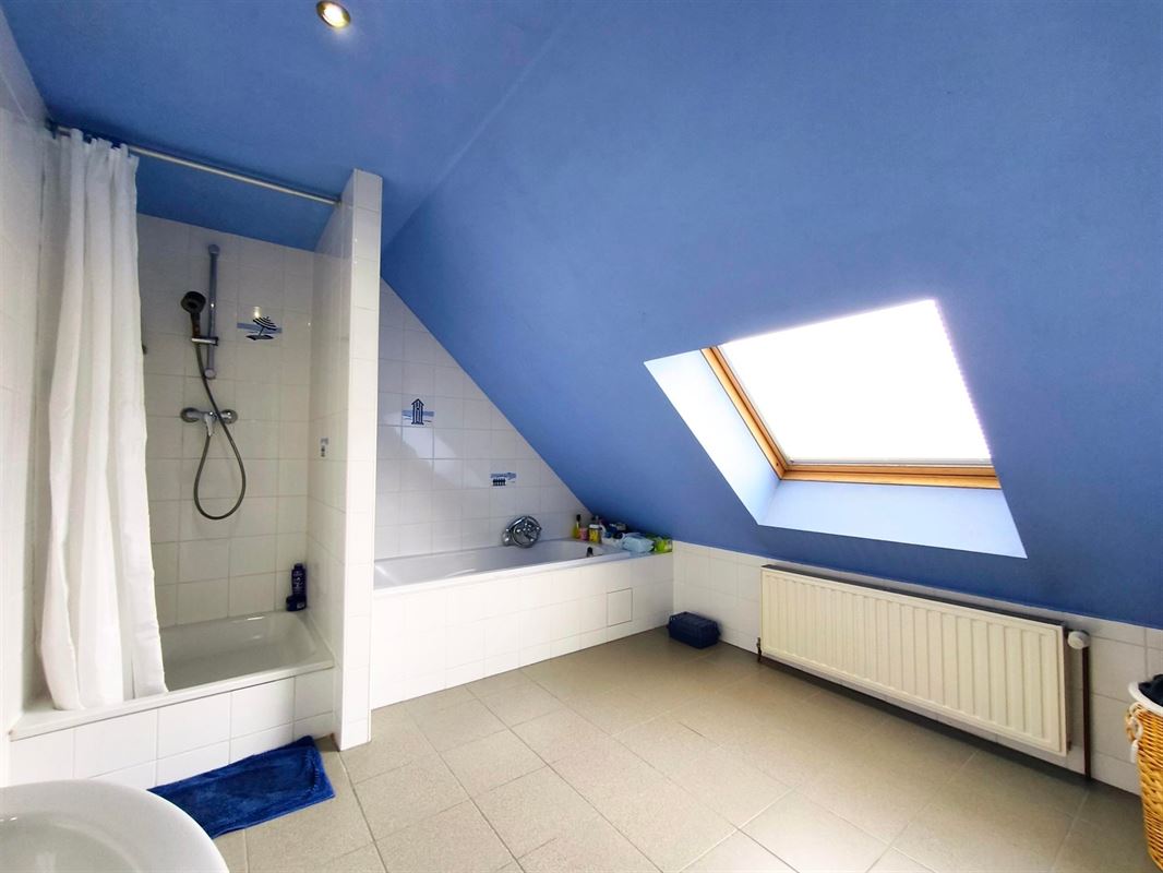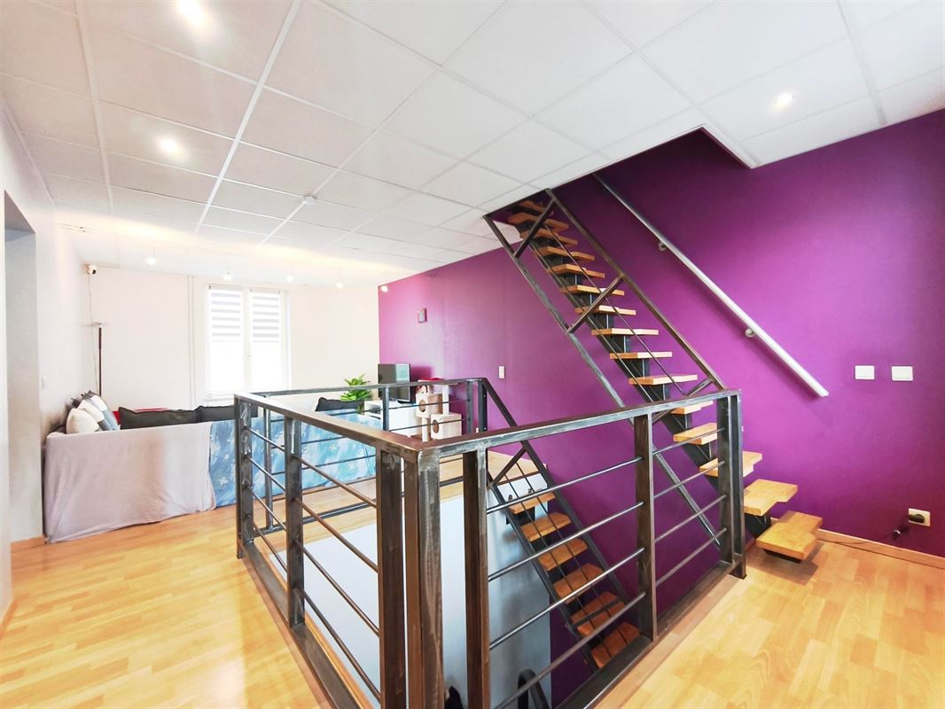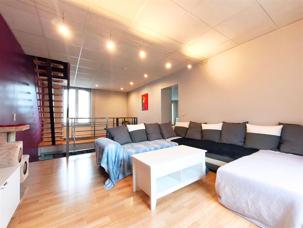 A l'étage ; une pièce de vie de + 16 m² menant vers une cuisine semi-équipée ouverte sur une seconde pièce de vie de +/- 26 m².
